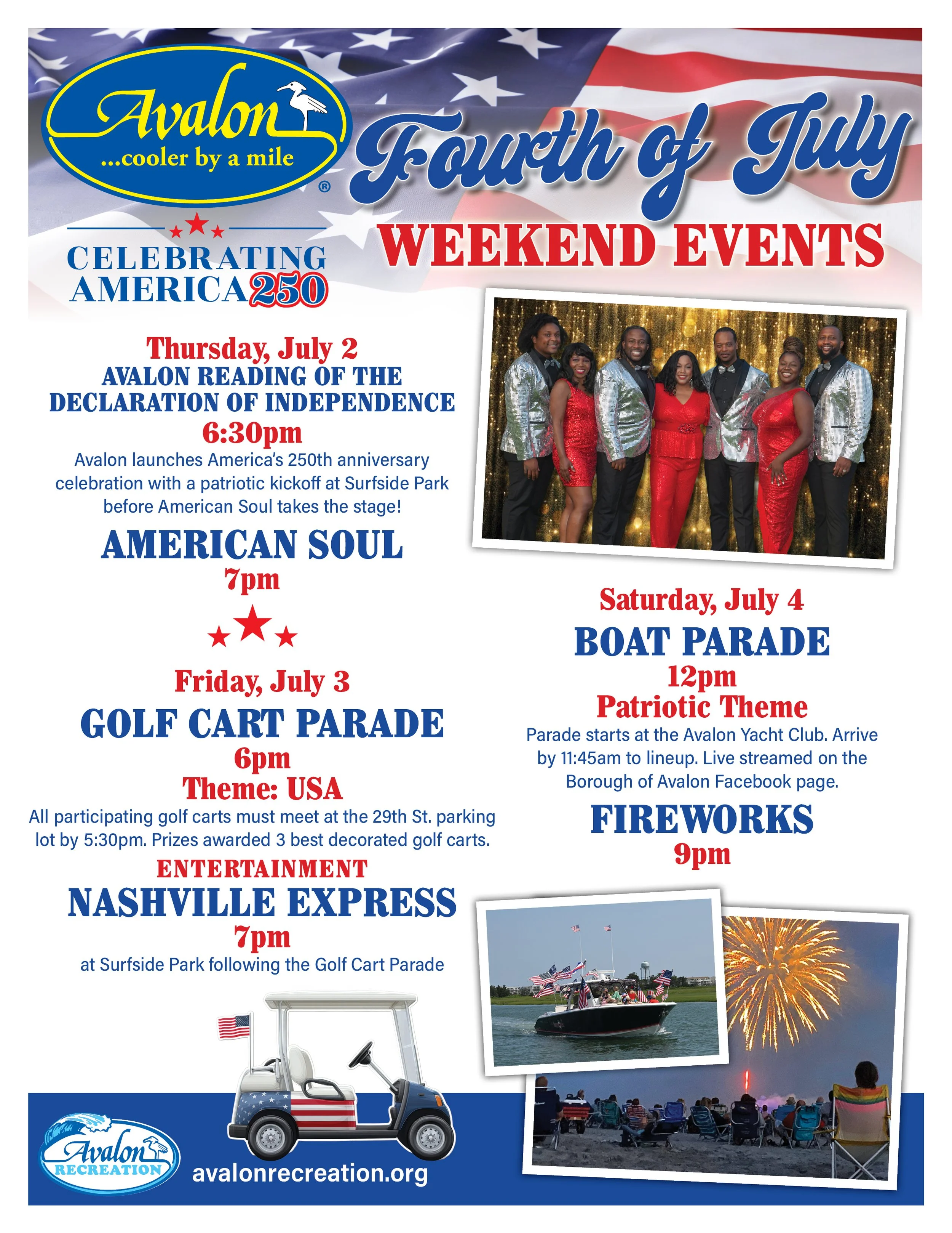2 Avalon’s Reading of the Declaration of Independence - 6:30pm, Surfside Park, Avalon launches America’s 250th anniversary celebration with a patriotic kickoff at Surfside Park before American Soul takes the stage!